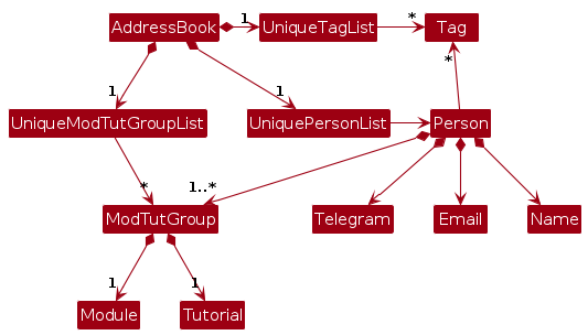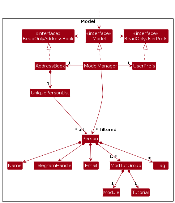 Person objects (which are contained in a UniquePersonList object).Person objects (e.g., results of a search query) as a separate filtered list which is exposed to outsiders as an unmodifiable ObservableList<Person> that can be 'observed' e.g. the UI can be bound to this list so that the UI automatically updates when the data in the list change.UserPref object that represents the user’s preferences. This is exposed to the outside as a ReadOnlyUserPref objects.Model represents data entities of the domain, they should make sense on their own without depending on other components)Note: An alternative (arguably, a more OOP) model is given below. It has a Tag and ModTutGroup list in the AddressBook, which Person references. This allows AddressBook to only require one Tag object per unique tag as well as only one ModTutGroup per unique ModTutGroup object, instead of each Person needing their own Tag or ModTutGroup objects.